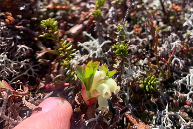 The leaves of alpine bearberry are net-veined on both sides, and have ciliate margins (hairs sticking out the sides of the leaves). Its stem is reddish and fruits are black. Alpine bearberry also has kind of strung out crinkly look to it because its leaves are deciduous but often retained, so once you’ve seen it you’re unlikely to mistake them for each other. Here is a photo of Arctostaphylos alpinus taken in Norway in spring 2023.