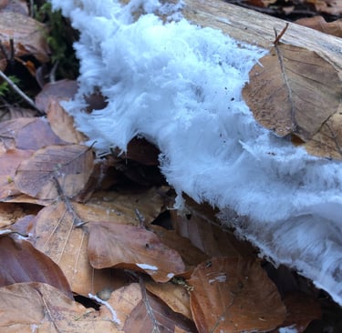 Today, I was ambling through a beechwood in the Trossachs where I grew up. There, in the mass of crinkling brown leaves was a tuft of white. I knew immediately what it was. Hair ice. I see it every year, often several times, and this is the best spot.