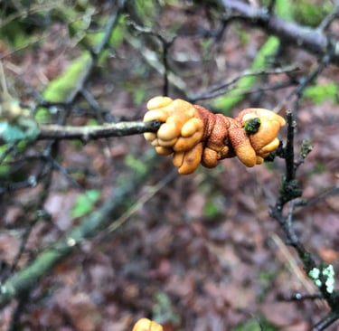 And there they were: a handful of crumpled orange blobs, floating upon a dead blackthorn, like a grotesque Christmas tree. Super exciting - hazel gloves fungus is a rare find and something I've been hoping to see for a while now. The species is under assessment for the IUCN Fungi Red List.