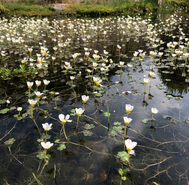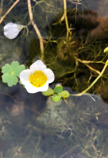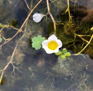 This striking flower is a member of the buttercup family, Ranunculaceae, which sort of makes sense when you see the flowers and leaf shape. A subset of the genus Ranunculus is made up of aquatic plants with white flowers, known as water-crowfoots.