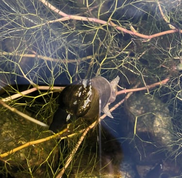 Below is a photo of an aquatic snail feeding on this population of pond water crowfoot. I don't know much about invertebrates, but think this could be a great pond snail, Lymnaea stagnalis, which has also not been recorded a great deal in Argyll, and also may have been introduced...