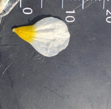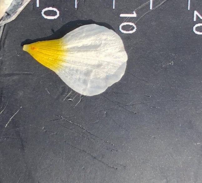 The next key feature is the shape of the nectar pits -what is a nectar pit? It's a little depression with raised sides the purpose of whcih is to hold nectar to attract pollinators. These are the orange-shaped depressions at the bottom of the petal, and can be crescent shaped, pear-shaped or round.