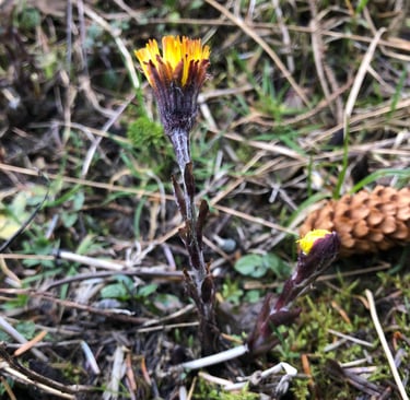 Colt's foot's takes an extreme approach to early-flowering - flower now ask questions later. The erect flowering stems appear significantly before the leaves, protruding somewhat extraterrerstrially from the... um... terre. Later in the year you often only see the large, cordate leaves forming extensive patches on gravel tracks and sand dunes - it is the shape of these leaves which give the plant its common name.
